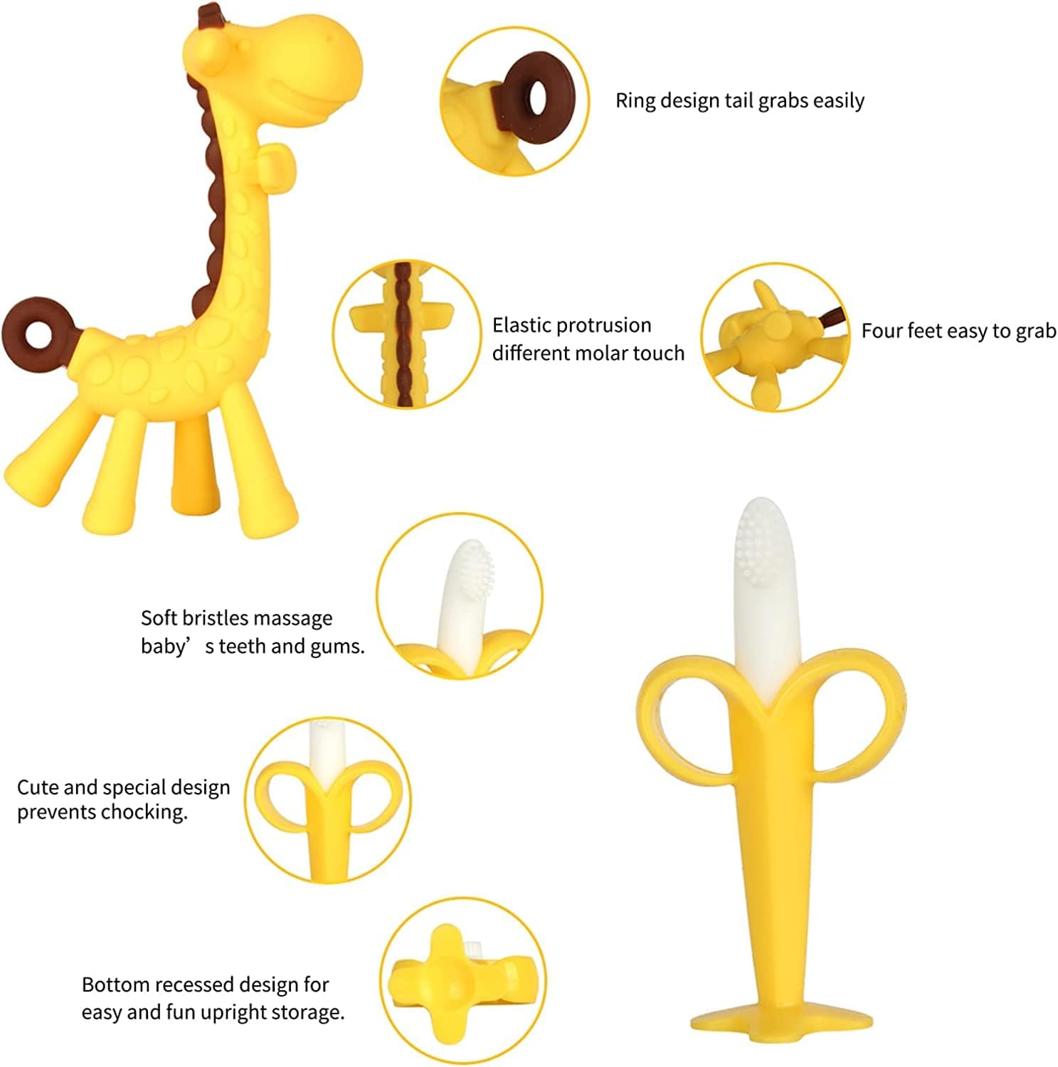 【Multifunctional Progress Set】Designed to satisfy the multi-stage wants of infants through the teething section. The set consists of: 1 giraffe teether, 1 banana teether, 1 peach teether, 1 orange teether, 2 feeder our bodies, and three silicone mesh nets of various sizes. With assorted shapes and colours, it accompanies infants as they discover.