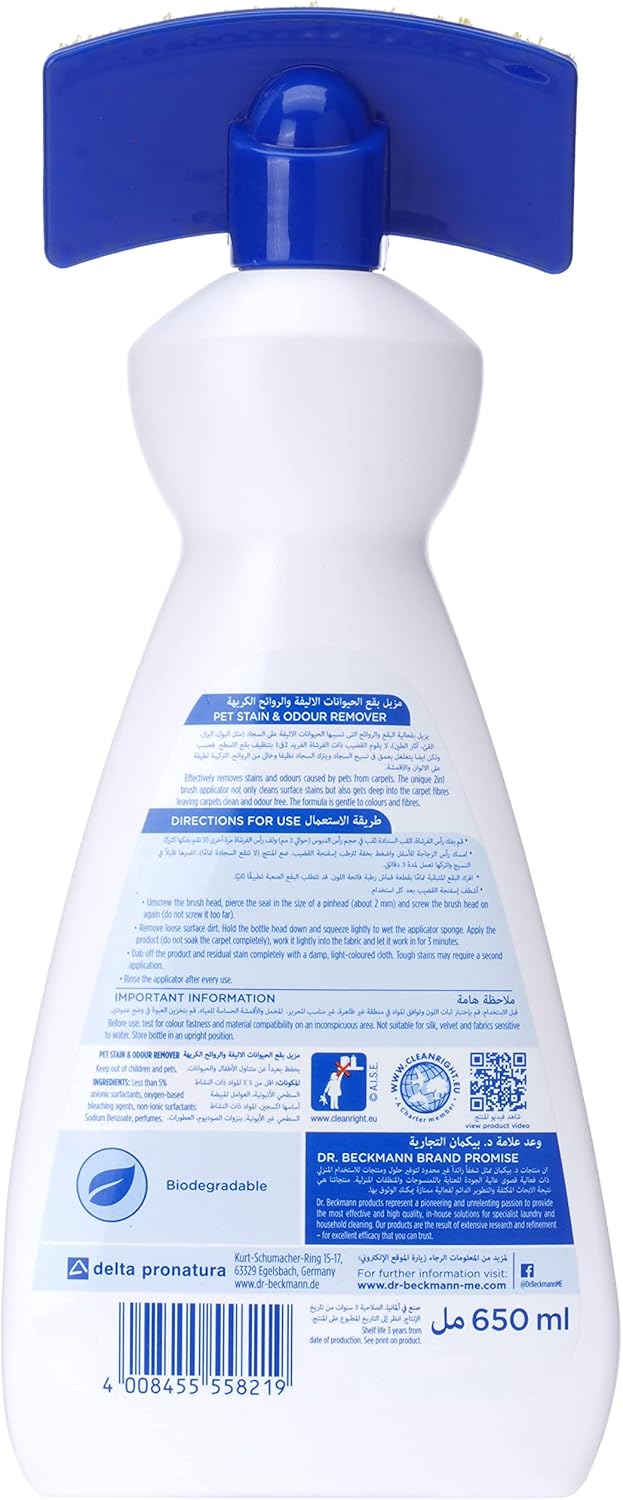 Dr. Beckmann Pet Stain & Odour Remover successfully removes stains and odours attributable to pets from carpets and fabric. The distinctive 2 in 1 brush applicator not solely cleans floor stains (sponge) but additionally will get deep into the carpet fibres (bristles) leaving carpets and fabric clear and odour free.All the time check for colourfastness/fibre compatibility prior to make use of by making use of a small quantity of the product to an not noticeable space of the carpet/upholstery after which go away for half-hour. Take away all residues of the product utilizing a moist white fabric and permit the check space to dry utterly. If the check space stays unchanged proceed with stain elimination. All the time observe producers care label directions for carpet and fabric. Don’t over saturate stained space as this might result in fibre injury. Don’t use on leather-based, suede, silk, velvet or any material which will be broken by water alone. Sure stains could cause everlasting discolouration which can’t be handled.