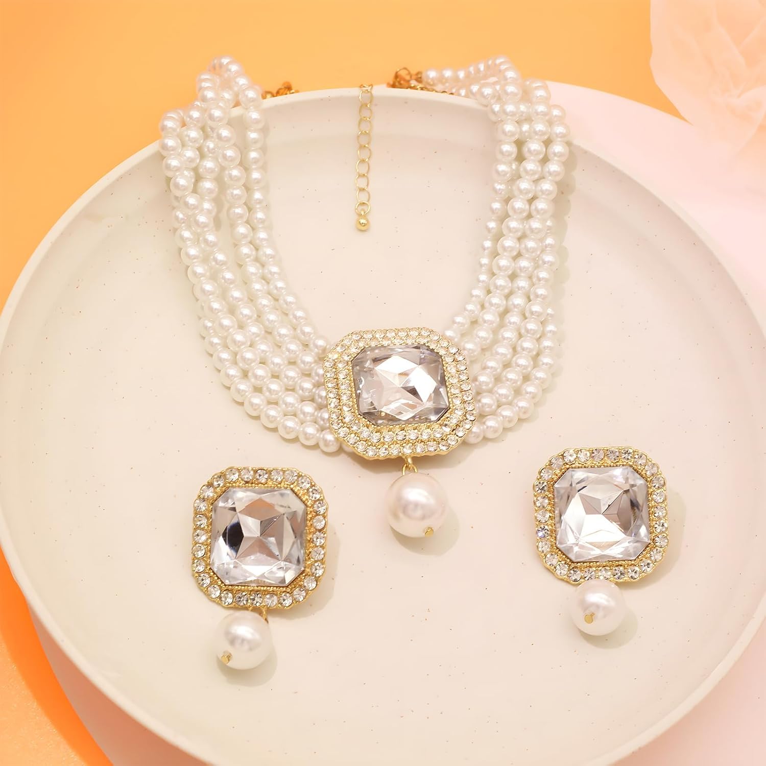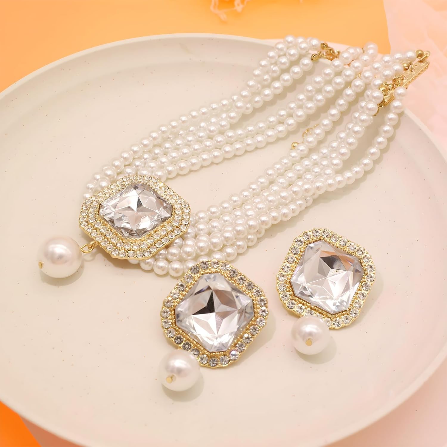 ✨ Elegant Pearl Necklace and Earrings Set for Girls – Rhinestone Crystal Pearl Choker Jewellery for Social gathering, Promenade, Wedding ceremony, and Formal Events