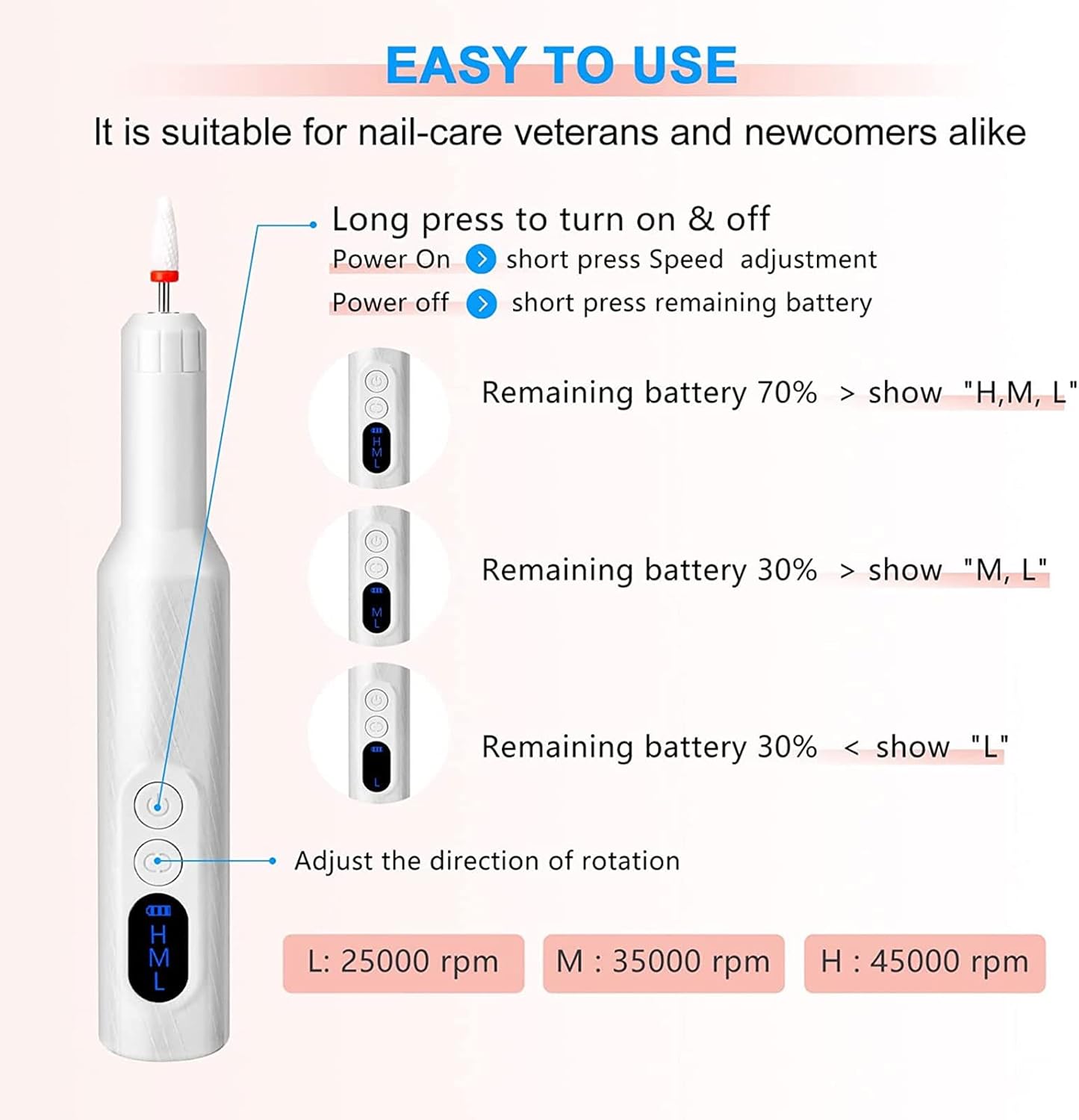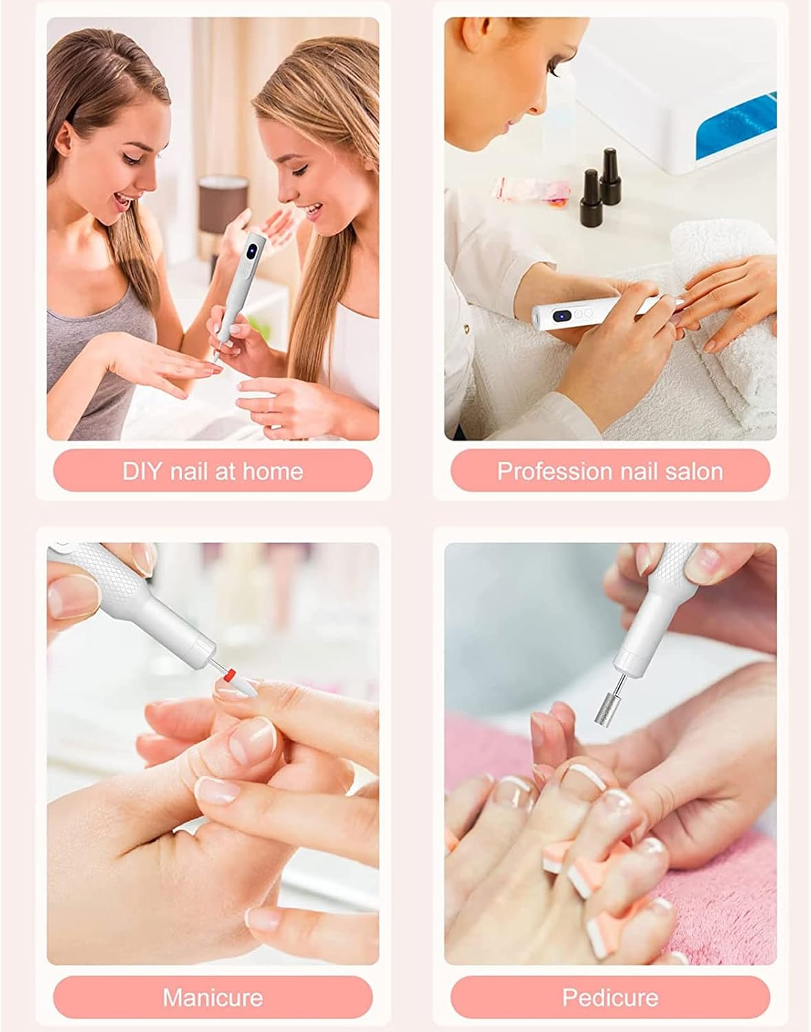 💅【Electrical Skilled Nail Drill】This Electrical Manicure Set applies an upgraded motor, the pace can attain 18000 RPM, the cordless nail drill can be utilized for all-around shaping,electrical nail file set which might simply sand, engrave, minimize, polish, take away gel polish and cuticles Layer, appropriate for newbie/skilled manicurist/salon use/house use.