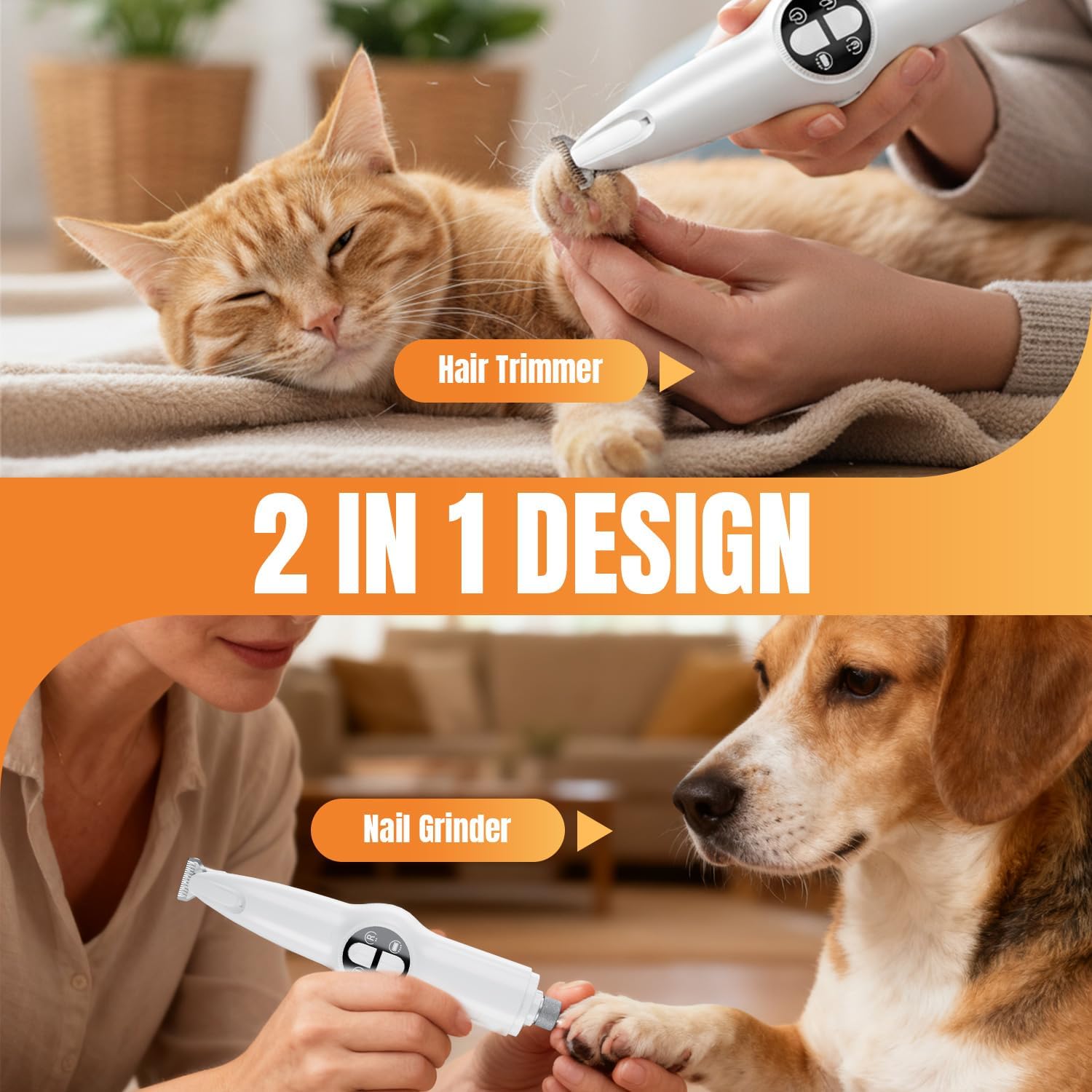 1.2-in-1 Pet Nail Clipper & Paw Hair Trimmer:Trim paw hair & polish nails in a single software! LED-lit foot head targets hidden fur between pads, whereas security grinding head prevents over-trimming. Good for anxious pets & multi-pet households.