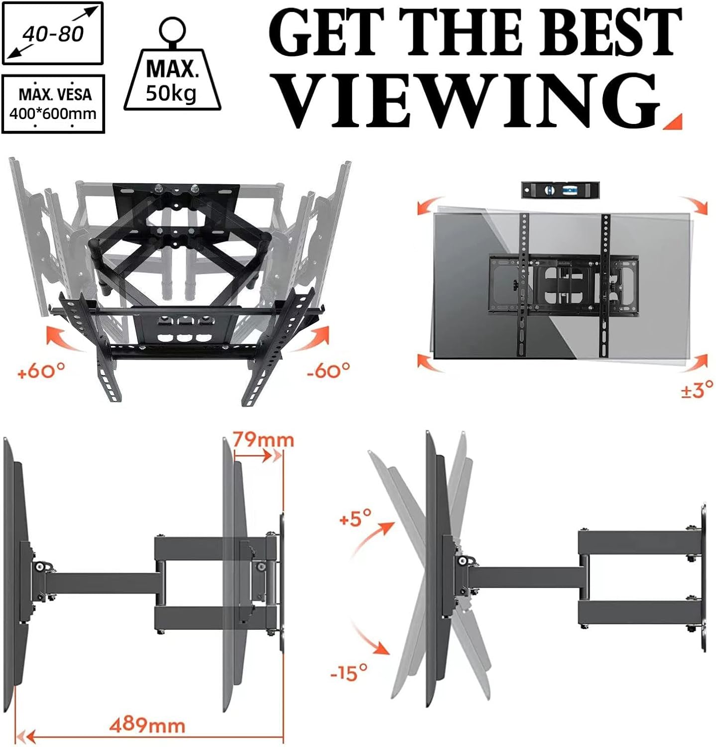 【Heavy tools】The TV wall mount bracket is designed to rotate and tilt, with hinged 6 arms for bearing. Robotic welding know-how makes this wall-mounted TV stand sturdy and secure.